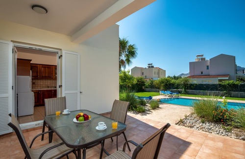 Athena Classico Villa has 2 fully air-conditioned bedrooms, one of them has a double bed and the other one has twin beds. Also, there are 2 bathrooms, one with a bathtub and one with a shower. There is a fully equipped kitchen suitable for any meal preparation accompanied by the sitting area. Also, there’s a comfortable living room with a screen TV with satellite channels as well as free Wi-Fi access throughout the property. Outdoors, you will find the exquisite private swimming pool with its sunbeds and the beautiful garden. Outdoor area of the house gives you a perfect opportunity to relax and enjoy your holidays while working on your tan. In addition there’s a BBQ facility and a sitting area to enjoy a gathering with your loved ones.
