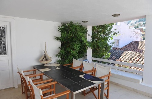 Welcome to a stunning retreat on Hydra island. Enjoy breathtaking views of white-walled buildings and terracotta rooftops. Cozy bedrooms feature artistic decor, while a rustic living room with a brick fireplace offers charm. The bright kitchen ensures convenience, and a serene SHARED patio surrounded by greenery is perfect for outdoor dining. Filled with natural light and artistic touches, this property combines relaxation, elegance, and the timeless beauty of Hydra.