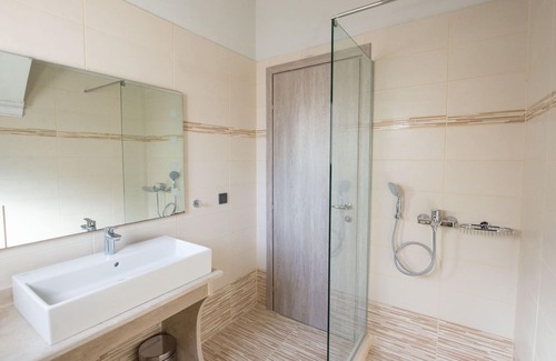 Double Suite 21: The suite can comfortably accommodate up to 6 guests in a living area of 60sq.m. It is a two level suite with modern furnishers, a king size bed, large sofa bed and en-suite shower on the ground floor, while interior stairs lead to the upper floor where another bedroom with king size bed and en-suite shower is. The suite features fridge, kettle, flat-screen TV and air-condition. On the ground there is a large veranda with view to the pool and the garden. A balcony on the upper floor is overviewing Erikousa suburbs, the pool and the garden area.