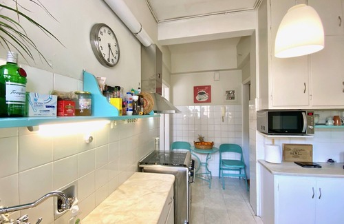 A sunny and quiet apartment located on the top floor of an aristocratic residential building in one of the most convenient areas of central Athens. The apartment is spacious (90m2) and has 1 bedroom w/ 1 double bed, a living area w/2 separate rooms, 1 sofa-double bed, 1 couch, 1 bathroom, 2 A/C, TV, WiFi (vdsl), spacious veranda, fully equipped kitchen. Just 6 minutes walk from the metro station and less than 1 minute from busses and trolleys. Perfect for a carefree vacation in Athens!