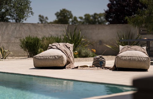 Unwind in the private outdoor area, which boasts a heated pool, sunbeds, umbrellas, a built BBQ, and a shaded dining space, perfect for savoring meals amidst serene surroundings.