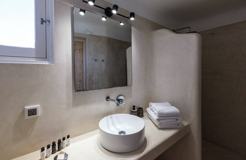 single sink and queen size bed. Access to the open patio with direct sea view and view to Ftelia Bay. The room is equipped with Safe Box, TV and A/C. From the room there is direct access to the sauna area, to the pool area while it has its own private balcony.
